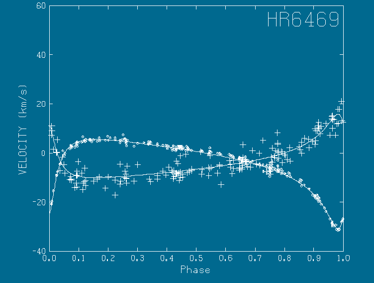 This plot shows the radial velocities of the primary and secondary of the star system HR6469. This system is a triple star system, where the third star is a subcomponent of the secondary. The third star makes itself known by means of a reflex velocity in the secondary (the parent of the third star). The plot shows the velocity of the primary (circles) and the secondary (pluses) with the reflex velocity removed. The solution was obtained with the Binary program where speckle and spectroscopic data were simultaneously considered. The data were originally published by Scarfe, Barlow, Fekel, Rees, Lyons, Bolton, McAlister, and Hartkopf in the A. J., 107, 1529 (1994).